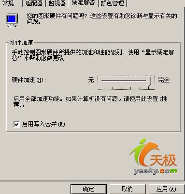 首先将屏幕状态切换到Windows 2003系统桌面上,然后用鼠标右击桌面的空白区域,从弹出的右键菜单中单击“属性”选项,打开系统的显示属性窗口;单击该窗口的“设置”标签,再在对应的标签页面中单击“高级”按钮,进入到高级显示属性设置界面;接下来再单击该设置界面中的“疑难解答”选项卡,并在其后出现的选项设置页面中,将“硬件加速”设置为“完全”,同时将“启用写入合并”选项(如图所示),并单击“确定”按钮,再将计算机系统重新启动一下,这样说不定就能将显卡驱动无法载入的故障顺利排除了。
