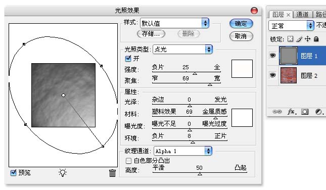 | 5、继续执行“光照效果”滤镜,“纹理通道”选择为“Alpha1副本”通道。 |