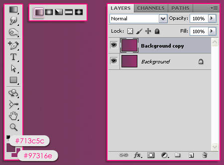 1、新建文件1600 * 1200像素。 创建一个线性渐变 ,从左至右,与前景颜色设置为 #713c5c ,背景颜色为 #97316e。 然后复制背景层。 |