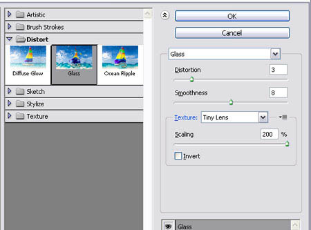 3、滤镜>扭曲>玻璃 ,设置扭曲3,光滑度8 , 纹理:小镜头 ,并缩放到200%。 |