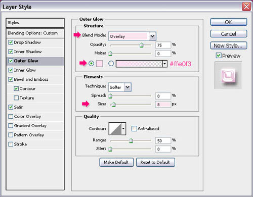 7、外发光:更改混合模式来叠加 ,对颜色#ffe0f3的大小以8像素。 |