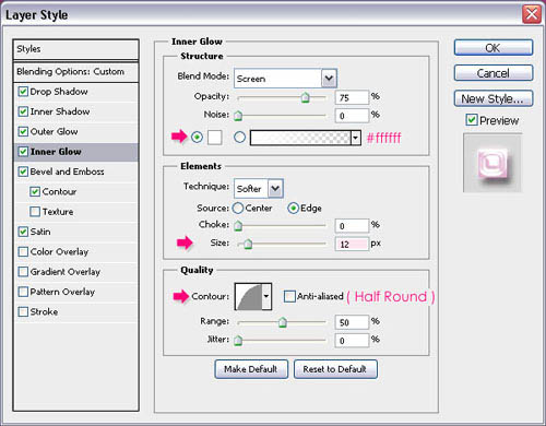 8、内发光:颜色更改为#000000 ,以及大小12 像素,等高线到半圆。 |