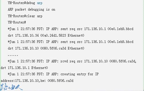 ARP调试启动,然后清除ARP缓存,同时产生了ARP请求和响应。首先,我们使用命令清除了思科路由器上所有的ARP缓存,因此思科路由器连接的每一个局域网段都将产生ARP报文。因为我们不需要产生过多的ARP报文,所以所选择的思科路由器仅与一个以太网段相连。