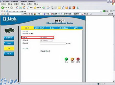 三、如果这台D-LINK路由器的前端有另一台D-LINK路由器,将此台D-LINK路由器的LAN IP地址改成192.168.0.2
