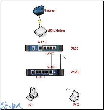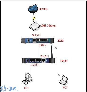 二、宽带线—ADSL MODEM—FR50(LAN口)—(WAN口)FW54R(无线)—电脑
