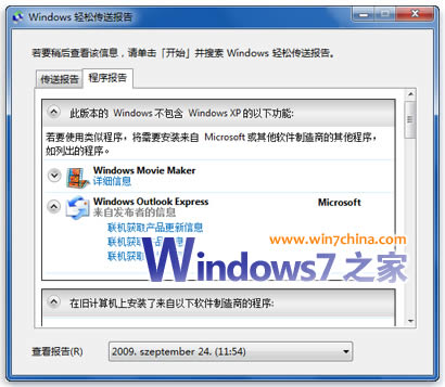6.在“传输已完成”页面,单击“查看已传输的内容”以查看从 Windows XP 移至 Windows 7 的用户帐户和文件的列表。单击“查看希望在新计算机上安装的程序列表”以查看以前在 Windows XP 中安装的程序。