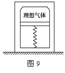 例9.如图9所示,密闭绝热的具有一定质量的活塞,活塞的上部封闭着气体,下部为真空,活塞与器壁的摩擦忽略不计,置于真空中的轻弹簧的一端固定于容器的底部,另一端固定在活塞上,弹簧被压缩后用绳扎紧,此时弹簧的弹性势能为EP(弹簧处于自然长度时的弹性势能为零),现绳突然断开,弹簧推动活塞向上运动,经过多次往复运动后活塞静止,气体达到平衡态,经过此过程