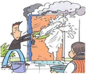 8、室外着火,门已发烫,千万不要开门,以防大火蹿入室内,要用浸湿的被褥、衣物等堵塞门缝,并泼水降温。