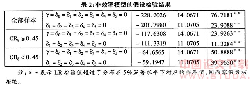 三个模型中方差参数的估计系数在1%显著水平上异于零,即r=0.9435、r=0.9333、r=0.6514,表明在201个制造业行业本地企业的工业增加值分析中技术非效率的影响可能是高度显著的,三个前沿生产函数的误差中分别有将近94%、93%和65%的成分来源于随机变量,不可控因素造成的白噪声误差占较小比例。表2显示了技术非效率不存在的零假设的广义似然比检验结果。三个模型中不存在技术非效率即 r=δ0=δ1=δ2=δ3=δ4=δ5=0的零假设在5%显著水平上被拒绝,说明模型中存在显著的技术非效率,因而采用随机前沿模型而非普通最小二乘法 (OLS)对生产函数进行估计是合适的;同时技术非效率不是企业规模、资本密度、行业集中度、外资参与程度和时间变量线性函数的零假设即 δ1=δ2=δ3=δ4=δ5=0也在5%显著水平上被拒绝,说明三个模型中尽管企业规模、模型3中的时间趋势项对生产中非效率的影响在统计上不显著,但 5个变量对生产中非效率的联合影响高度显著。很明显,生产函数中的技术非效率不仅是随机的,且与企业规模、资本密度、行业集中度、外资参与程度和时间5个变量存在显著的线性关系,因而方程(4)和(5)模型设定是合理、可靠的。