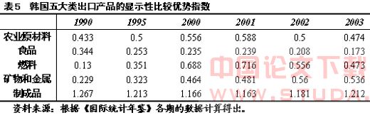 根据公式(1)和《国际统计年鉴》的分类数据,我们计算出了中国五大类出口产品在不同时期的显示性比较优势指数(见表1)。