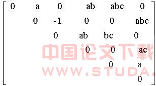 而应用本文给出的算法,区分线性表只有{b,c}一个元素,计算过程如下:首先得到区分属性集{a},a进入核变量,在随后生成的区分属性集中只要含有a,则直接约掉,{b,c}进入区分线性表,采用启发式算法,可得到约简{a,b}。而基于区分矩阵的属性约简算法构造的区分矩阵如下: