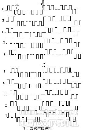 双频电流的产生是双频供电部分的核心。双频发送机首先将两种频率的方波电流合成双频电流,然后将其供入地下。何继善1981年撰文论述了各种双频电流波的合成及其特点(何继善,1981.No. 6,中南矿冶学院学报)。图1是几种双频电流波形示意图。在经过理论分析和实验验证后,何继善指出,两种频率间的相位差为π、频差为奇数倍(如9倍或13倍)的那些双频电流波的波形整齐,容易产生,而且可以减少双频电流间的相互影响。另外,使用双频供电方法,不需要对电流采用稳流措施。双频观测方案可以自动消除电流变化对测量结果的影响或畸变。这不仅减轻了供电装置的重量,同时也提高了电源利用率和测量的速度,因此可以降低生产成本,且利于山区工作。对于变频法和奇次谐波法,其供电部分则必须采用稳流措施。