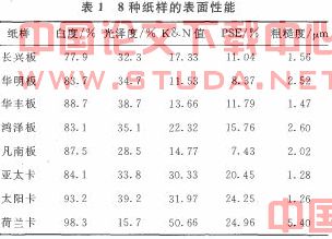 实验仪器:WSB一Ⅱ白度计;UGV一50型VARIABIEGLOSSMETER变角光泽仪;YM一20油墨吸收性测定仪;ModelM590PAKERPRINT—SURF表面粗糙度测试仪。实验环境:温度21℃,相对湿度49~51。通过实验,8种纸样的各项性能数据见表1。