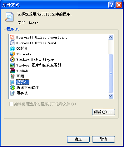 2、双击hosts文件,在“打开方式”中选择“记事本”,点击“确定”