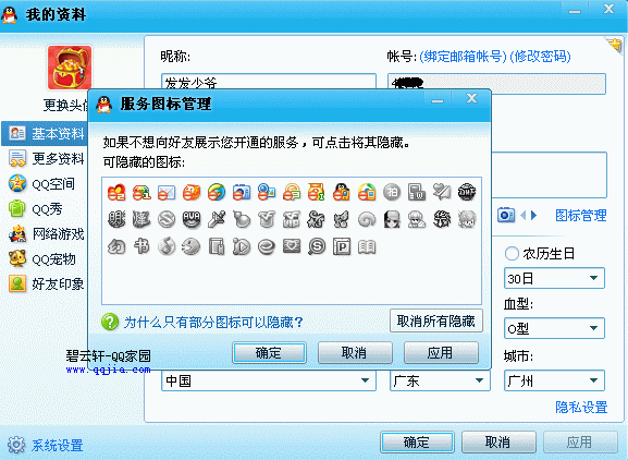 目前可设置隐藏的图标有44个:红钻、蓝钻、黑钻、紫钻、腾讯公益、彩钻、QQ邮箱、QQ堂、城市达人、QQ相册、QQ播客、搜吧、问问、手机QQ、手机腾讯网、拍拍、WAPQQ、地下城与勇士、大明龙权、烽火战国、丝路英雄、战地之王、英雄岛、寻仙、穿越火线、穿越火线VIP、QQ幻想世界、QQ炫舞、自由幻想、QQ飞车、QQ三国、QQ华夏、QQ音速、QQ幻想图标、图书VIP、QQ音乐、滔滔、QQ书签、QQLive、Q吧、QQ爱墙、搜搜个人中心、QQ拼音输入法、搜搜百科。 后续将会逐步开放全部的图标可设置隐藏,不可以隐藏的有15个。包括黄钻、绿钻、粉钻、QQ会员、会员炫铃、超级QQ、QQ短信超人,这7个付费的业务,不给钱就停了。 还有另外8个图标也比较容易干掉:取消手机绑定、怎么熄灭QQ宠物图标、视频用户、如何关闭QQ空间、如何熄灭QQ家园图标、怎么关闭财付通图标、怎么熄灭超级旋风图标、怎么熄灭QQ校友图标。 下面就以QQ2010正式版为例,介绍一下如何隐藏QQ图标: 请注意,这个隐藏,不是关闭,你可以随时点亮它,只要在已经关闭的图标上在点一下就可以了。